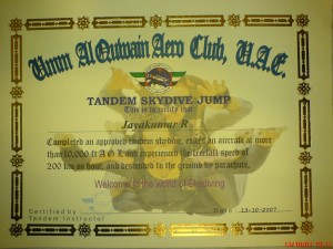 My friend Bhuvan did all the research and mentioned that there is a place called Umm-Al-Quwain where we can do sky-dive and wanted to know if I was interested. It was hardly a month before our term exams and I knew, it’s now or an opportunity lost. So decided to go for it. On the day of the jump it was a mix of nervousness and excitement. Bhuvan, Rachita and myself reached the place at around 9am, signed a hand full of papers, got introduced to our trainer and finally all set inside the plane after a small training session. On reaching 11K feet, there was only one thing that crossed my mind. “I can’t believe I am doing this” 🙂