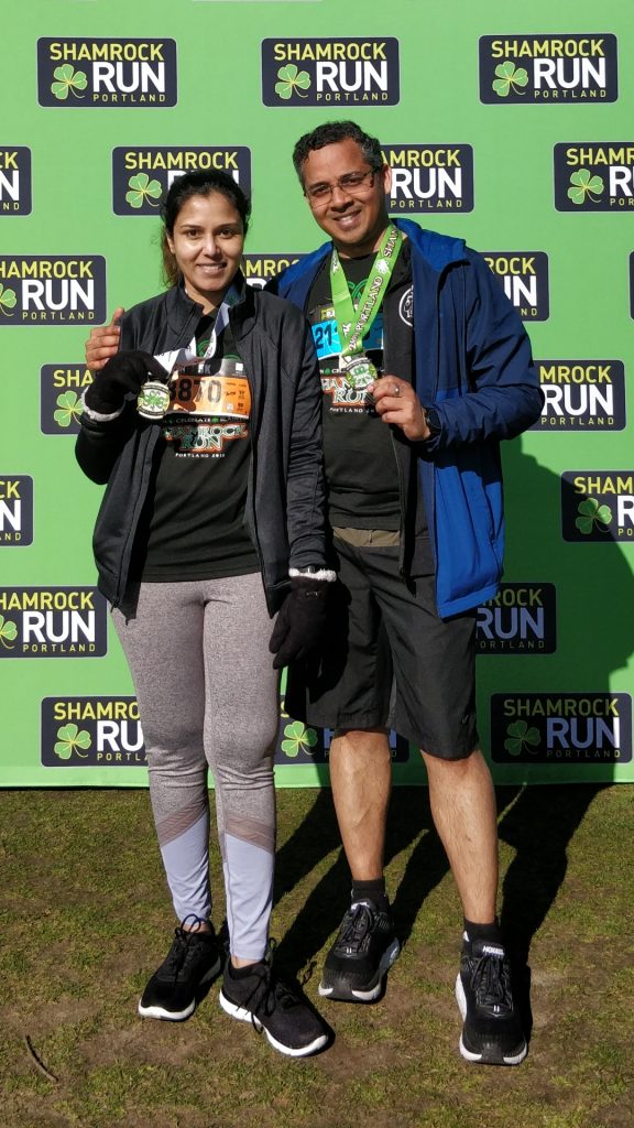 After his run, he got to enjoy his favorite bounce house, while I did my “5K” (which was closer to 3.xK in and finished in 20min 22sec. The best part? We all got to wear the same event T-shirt (mom-dad and Ashvik), which made it feel like a real family day out.