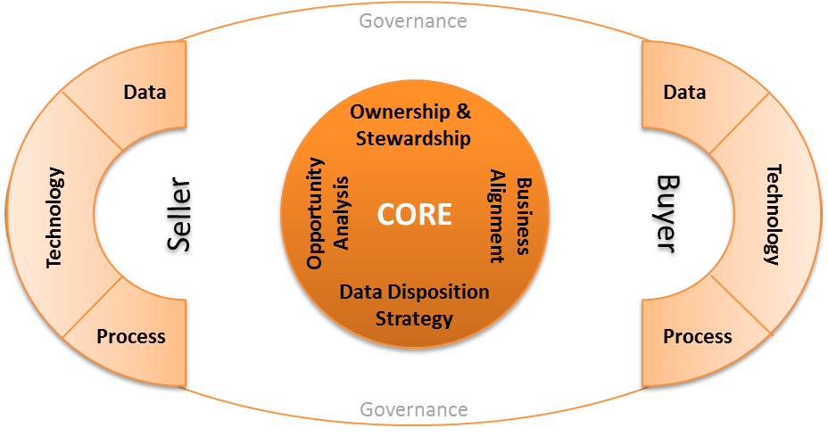 - Core component: Handles all activities related to overall due-diligence related to data such as identifying data owners and stewards, data disposition strategy, value creation opportunity (VCO), and enterprise-level data integration with core applications at the buyer and seller end.
